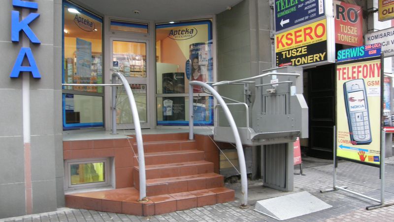 Wejście do apteki po schodach. Z boku schodów zamontowana jest winda przeznaczona dla osób niepełnosprawnych (winda poddawana jest regularnym przeglądom technicznym) - przy windzie zamontowany jest dzwonek umożliwaijący wezwanie pracownika apteki celem uruchomienia windy.Wnętrze
