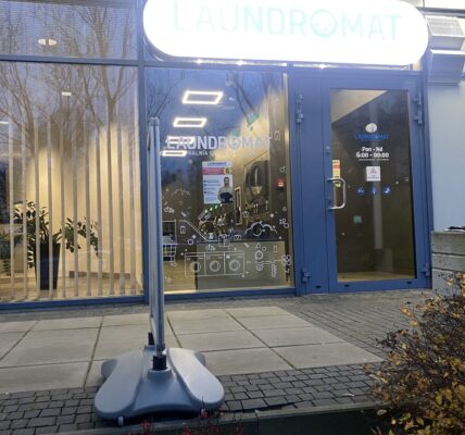 Przed wejściem do obiektu jest chodnik z wysokim krawężnikiem z ulicy.